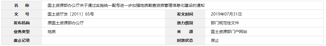 為提高地質(zhì)勘查資質(zhì)管理水平,完善地質(zhì)勘查資質(zhì)信息系統(tǒng)建設(shè),更好地應(yīng)用信息化手段促進(jìn)地質(zhì)勘查資質(zhì)管理工作的規(guī)范化,實現(xiàn)政務(wù)信息公開,提高透明度,現(xiàn)就通過實施統(tǒng)一配號進(jìn)一步加強地質(zhì)勘查資質(zhì)管理信息化建設(shè)有關(guān)事項通知如下: