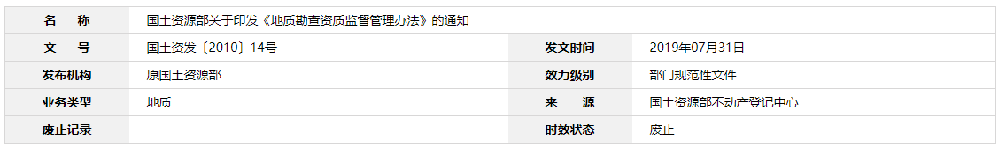 第十條 省級以上國土資源主管部門應當將《地質(zhì)勘查資質(zhì)管理信息系統(tǒng)》納入綜合監(jiān)督管理平臺,加強地質(zhì)勘查資質(zhì)監(jiān)督管理,及時統(tǒng)計、發(fā)布信息,方便公眾查閱和社會監(jiān)督,提高監(jiān)督管理的質(zhì)量和效率。