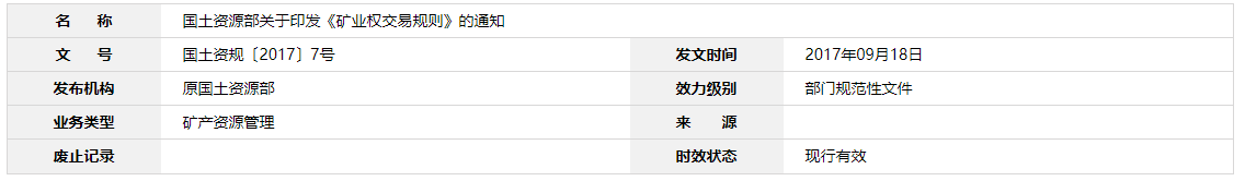 為貫徹落實國務院整合建立統一的公共資源交易平臺等有關工作要求,進一步規范礦業權交易行為,促進礦業權市場健康發展,現將《礦業權交易規則》印發給你們,請遵照執行。