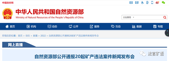 2022年3月17日,自然資源部在官網公開通報了20起礦產違法案件,并召開了新聞發布會。自然資源部通報的20起案件均涉及非法采礦罪。該新聞發布會信息鏈接地址為: