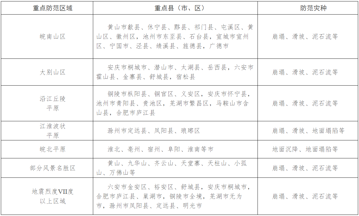 2.重點防范地段:在建地鐵輕軌沿線兩側1km范圍內;在建高速鐵路、高速公路和引江濟淮工程沿線兩側1km或第一斜坡帶范圍內;淮南煤礦區、淮北煤礦區、銅陵銅礦區、霍邱鐵礦區、廬江鐵(銅)礦區等5個礦山建設區域。