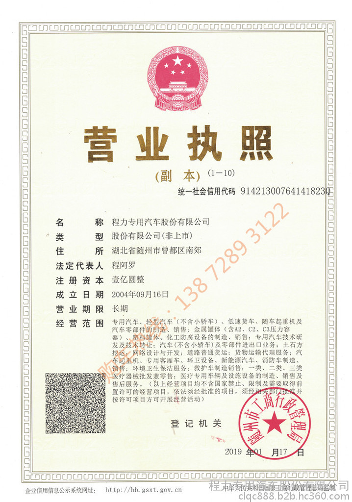 營業(yè)執(zhí)照號:程力專用汽車股份有限公司
