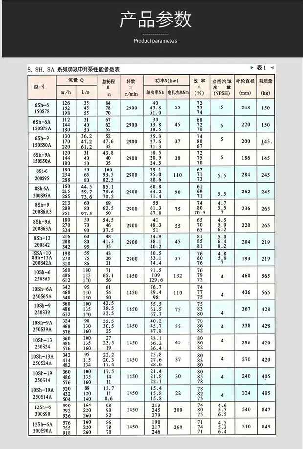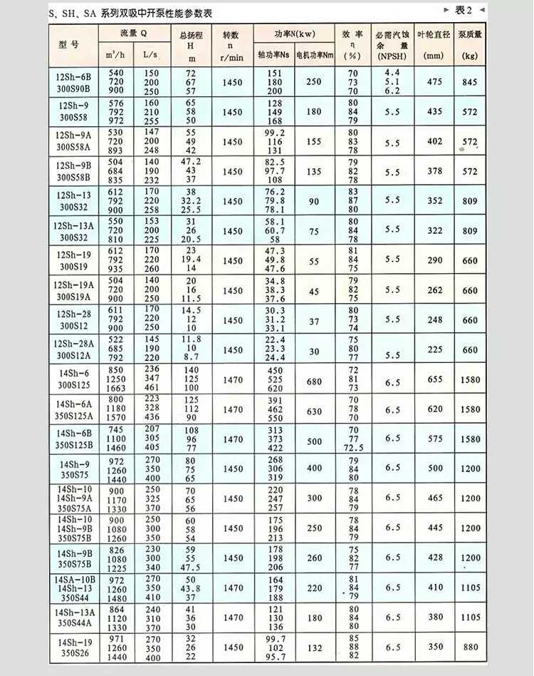 SH型泵及S型泵統稱為雙吸泵,其工作性能及配用電機大體相同。需要說明的是泵的旋轉方向不同,從電機端看SH型泵為逆時針旋轉,而S型泵則順時針。在實際使用中SH型泵更加廣泛,故以下介紹以SH型泵為主。