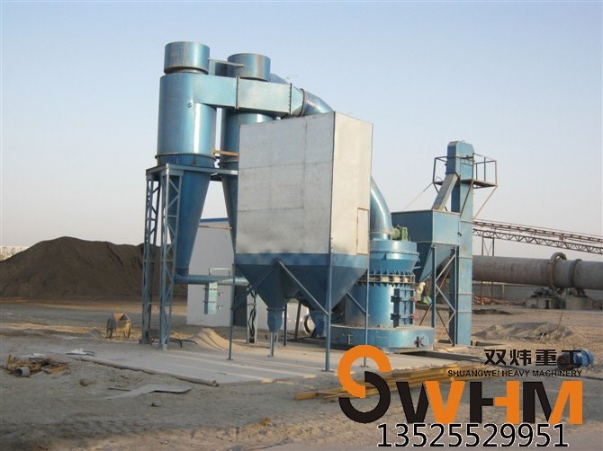 大塊狀物料經鄂式破碎機破碎到所需要粒度后,由提升機將物料送至儲料斗,再經振動給料機均勻定量連續地送入主機磨室內進行研磨,粉磨后的粉料被風機氣流帶走。經分析機進行分級,符合細度的粉料隨氣流經管道進入大旋風收集器內,進行分離收集,再經粉管排出即為成品粉料。氣流再由大旋風收集器上端回風管吸入鼓風機。本機整個氣流系統是密閉循環的,并且是在負壓狀態下循環流動的。