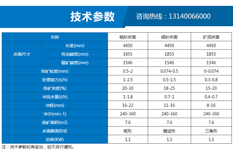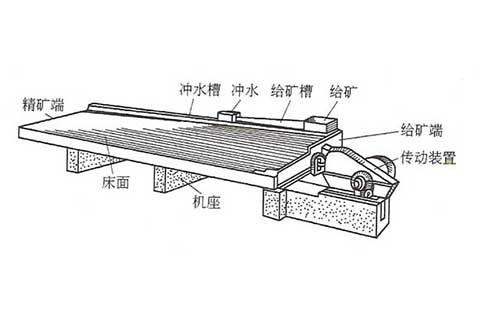 選礦過程是在具有來復條的床面上進行的,礦粒群從床面上角的給礦槽送入,同時由給水槽橫向沖洗水,于是礦粒在重力,橫向流水沖力,床面作往復不對稱運動所產生的慣性和摩擦力的作用下,按比重和粒度分層,并沿床面做縱向運動和沿傾斜床面做橫向運動。因此比重和粒度不同的礦粒沿著各自的運動方向逐漸沿對角線呈扇型流下,分別從精礦端和尾礦側的不同區排出,后被分成精礦、中礦和尾礦。