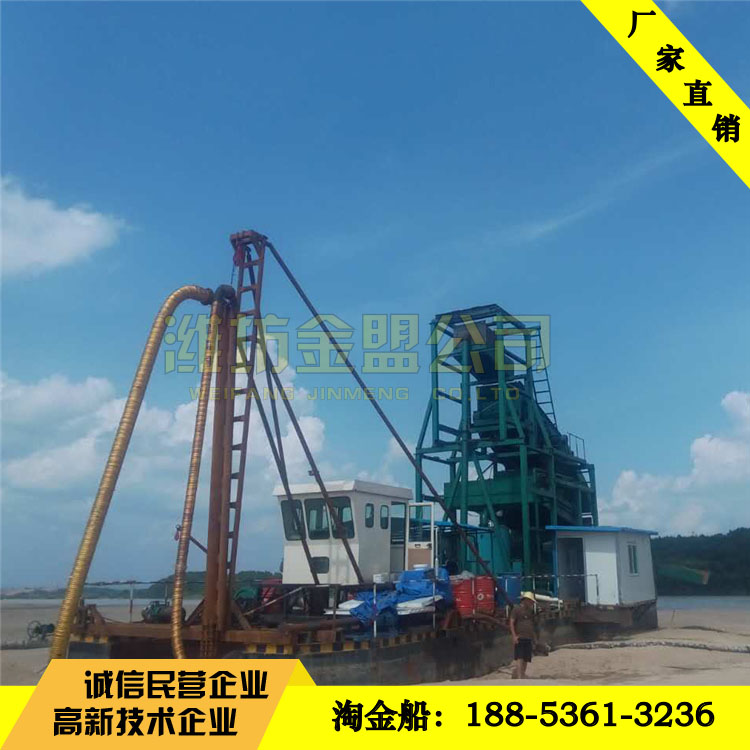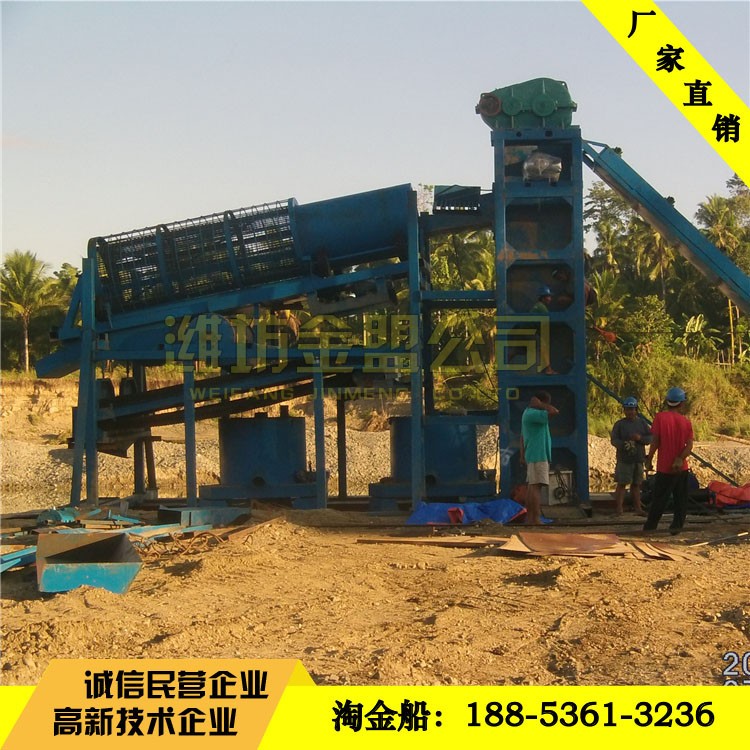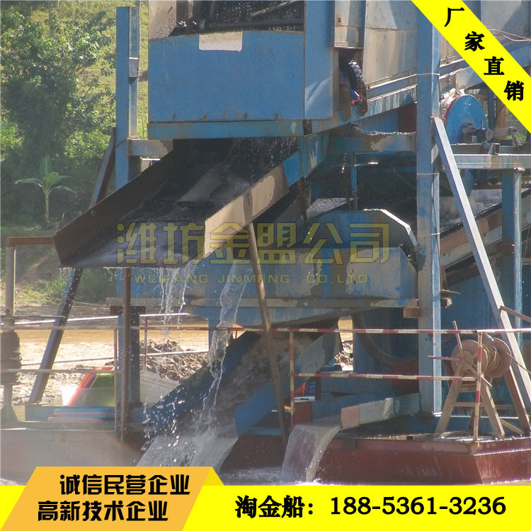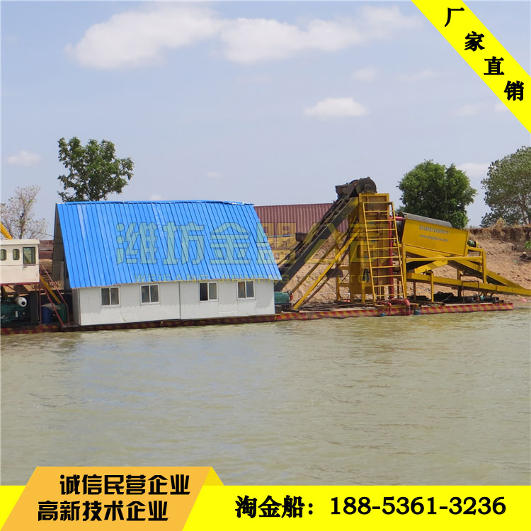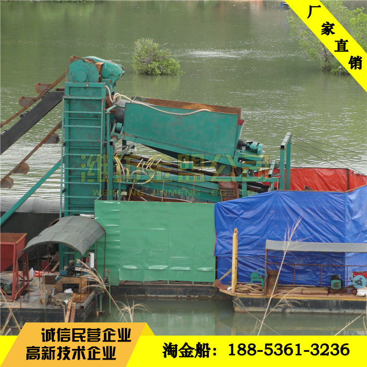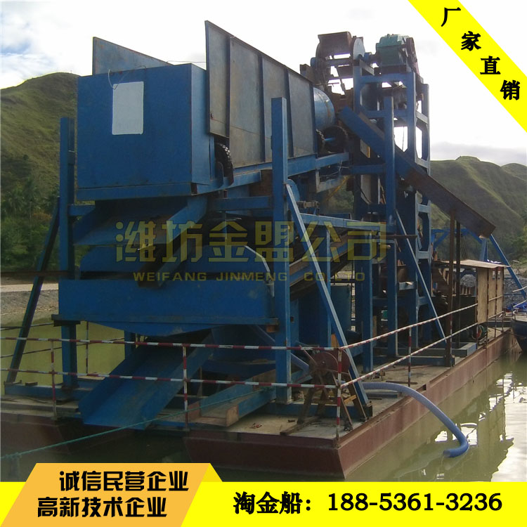 淘金船、淘金設備選礦經滾筒篩篩分后,5mm~15m的礦物料進入大顆粒金選礦槽內選礦,調整好溜槽的角度、水流速,用進口三菱金氈回收大顆粒金。