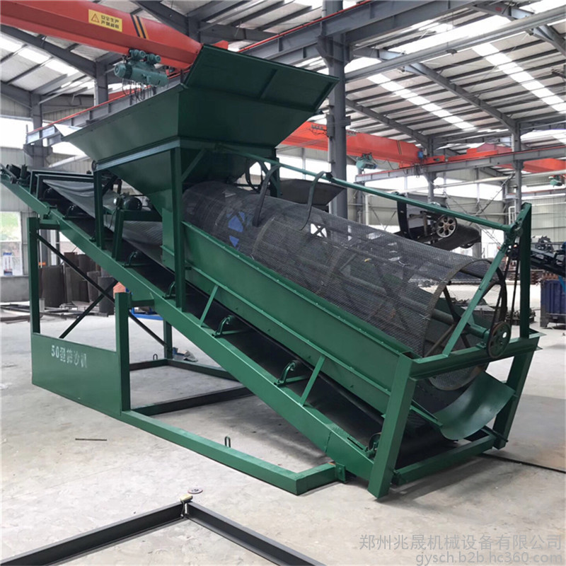 可以直接放置于平整的地面或樓板上及料倉下。滾筒篩可設有梳型清篩機構,在篩分過程中滾筒篩砂機可通過梳型清篩機構與篩分筒的相對運動,達到對篩體不間斷清理的效果,使篩分筒在整個工作過程中始終保持清潔、不粘、不堵、不影響篩分效果。根據不同分級要求,滾筒篩分級級數一般從細到粗為1-4節,物料從細到粗分別從篩網篩出,大于篩網孔的物料從出料口排出。滾筒篩的主體結構是篩分筒,它是由若干個圓型狀篩網組成,整體與地平面成傾斜狀態,外部被密封隔離罩所密封,以防止污染環境。