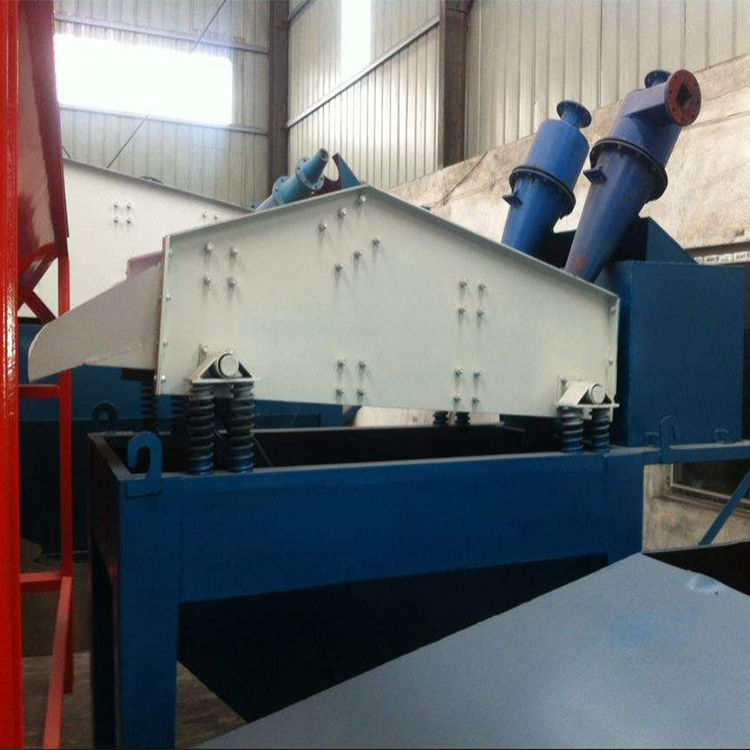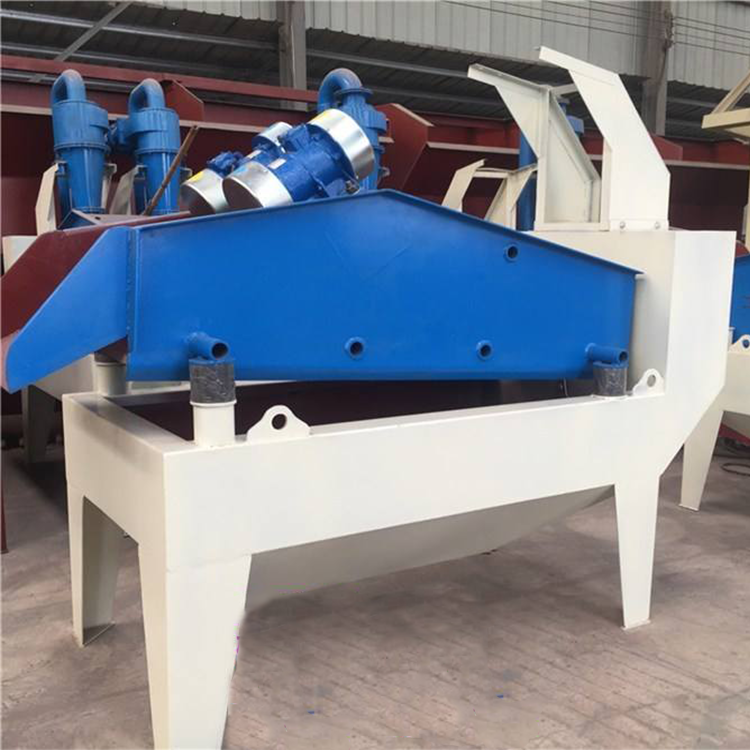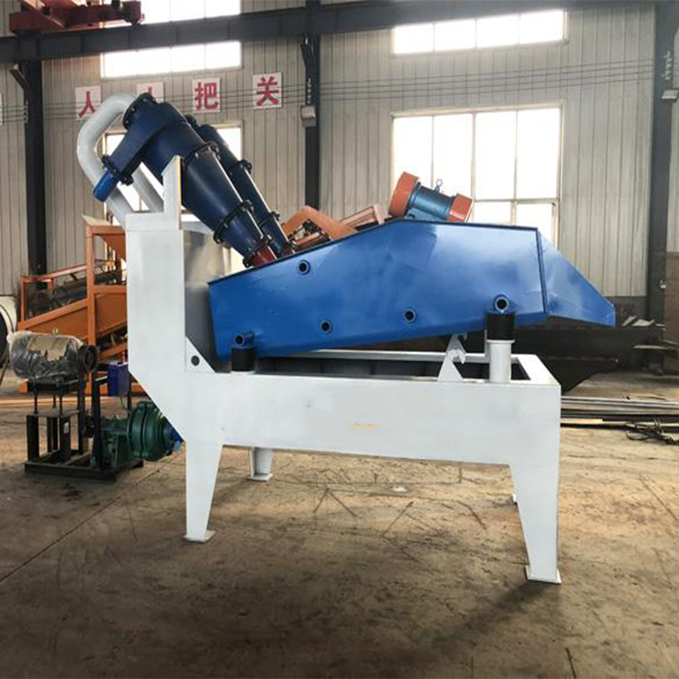 本裝置之由洗料槽、砂漿泵、電機、旋流器、直線振動篩、回料箱等組成。工作時砂漿泵、水泥混合物輸送至旋流器,通過旋流器離心分級,濃縮的細砂經出料箱供給振動篩,經直線振動篩脫水,細砂由篩前輸出。少量細砂由回料箱返回洗料槽。洗料槽液面過高時經溢流管排出。振動篩輸出細砂含水量(25%)調解細度模數可通過改變泵的轉速,改變砂漿濃度,調節水量,更換出砂嘴來實現,從而完成清洗脫水和分級三種功能。