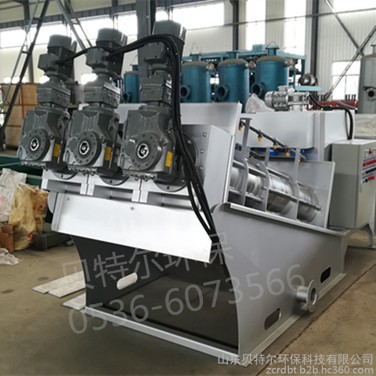 2、脫水:經(jīng)過濃縮的污泥隨著螺旋軸的轉(zhuǎn)動(dòng)不斷往前移動(dòng);沿泥餅出口方向,螺旋軸的螺距逐漸變小,環(huán)與環(huán)之間的間隙也逐漸變小,螺旋腔的體積不斷收縮;在出口處背壓板的作用下,內(nèi)壓逐漸增強(qiáng),在螺旋推動(dòng)軸依次連續(xù)運(yùn)轉(zhuǎn)推動(dòng)下,污泥中的水分受擠壓排出,濾餅含固量不斷升高,最終實(shí)現(xiàn)污泥的連續(xù)脫水。