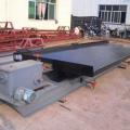 選礦設備,由平面溜槽發展而來,以后以其不對稱往復運動為特征而自成體系。搖床均由床茴、機架和傳動機構三大部分組成,床面呈梯形或菱形,在橫向有1。~5。傾斜,在傾斜上方配置給礦槽和給水槽,床面上沿縱向布置床條,其高度自傳 端向對側降低。整個床面由機架支承,在床面一端安裝傳動裝置,后者可使床面前進接近末端時具有急回運動特性,即所謂差動運動。 豫曉機械公司生產的6S搖床,又稱6S搖床,