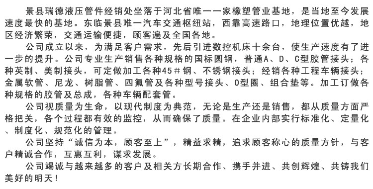 高壓鋼絲編織膠管用途:高壓鋼絲增強(qiáng)液壓油管主要用于礦井液壓支架、油田開發(fā),適宜于工程建筑、起重運(yùn)輸、冶金鍛壓、礦山設(shè)備、船舶、注塑機(jī)械、農(nóng)業(yè)機(jī)械、各種機(jī)床以及各工業(yè)部門機(jī)械化、自動(dòng)化液壓系統(tǒng)中輸送具有一定壓力和溫度的石油基(如礦物油、可溶性油、液壓油、燃油、潤(rùn)滑油)及水基液體(如乳化液、油水乳濁液、水)等和液體傳動(dòng)。